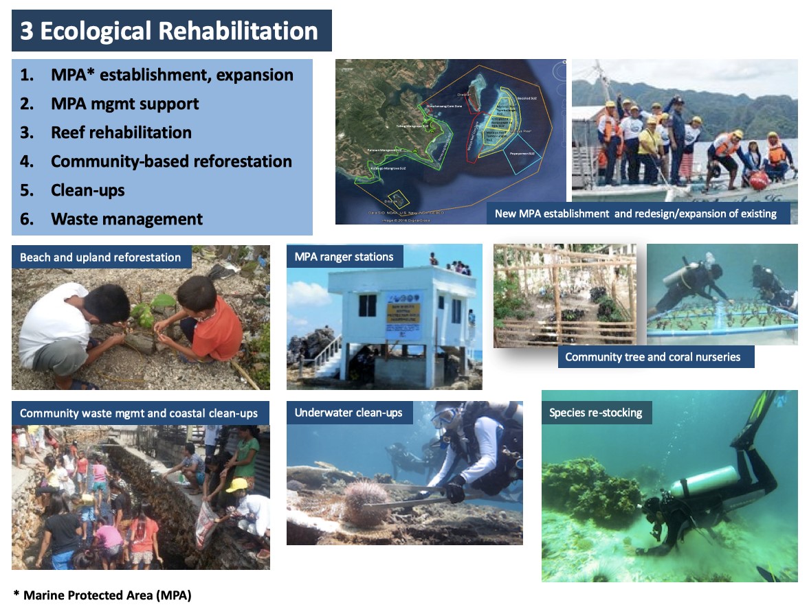 Unfortunately, degradation of the Philippines’ marine and terrestrial ecosystems has been widespread since the 1950s due to exploitation and destructive methods of extraction, sometimes leaving irreversible damage in the process. Other anthropogenic root causes include indiscriminate land and coastal development, poor or lack of waste management systems and deforestation. The consequences of these human actions have been evident in increasing severity and impact of natural disasters on humans, as well as reduction in the biological productivity of ecosystems for the benefit of people and animals alike.